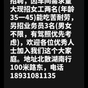 招聘 招聘 因车间需求量大现招女工(年龄35一45)能吃苦耐劳。 另招业务员3名(男女不限,有驾照优先考虑)。 欢迎各位优秀人士加入我们这