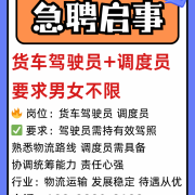 招聘 急聘! 货车驾驶员+调度员 男女不限 岗位:货车驾驶员、调度员 ✅ 要求:驾驶员需持有效驾照,熟悉物流路线;调度员需具备协调统
